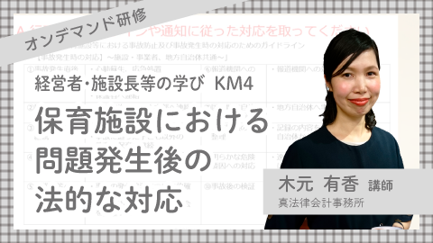 保育施設では日々様々なことが起こります。今回、保育施設の案件を多く担当されている弁護士の木元先生が、一問一答でお答えする講座ができました。問題発生後の法的な対応を知り、それに備えての準備や適切な初動対応をとることで、園と職員そして子どもたちと保護者を守る。その一助として、是非ご覧いただきたい講座です。